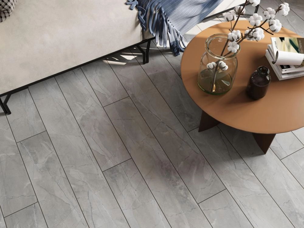 Благодаря широкому формату планок (1292×246 мм), пол визуально расширяет пространство, делая любую комнату более светлой и просторной. Четырехсторонняя фаска аккуратно подчеркивает каждую доску, создавая эффект укладки натуральными каменными плитами и придавая полу дополнительный объем и глубину.