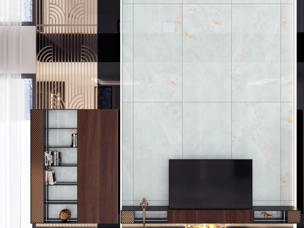 Керамогранит Buono Ceramica Onice Luna Glossy – это воплощение природной элегантности и современных технологий. Его поверхность, имитирующая драгоценный оникс, наполнена глубиной и светом. Нежный, почти прозрачный светло-зеленый фон с легким мятным подтоном и белыми дымчатыми разводами создает ощущение воздушности и простора. Яркими акцентами выступают золотисто-оранжевые прожилки, которые, словно солнечные лучи, пробиваются сквозь толщу камня, добавляя покрытию теплоты и роскоши.