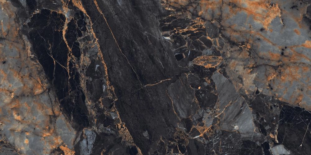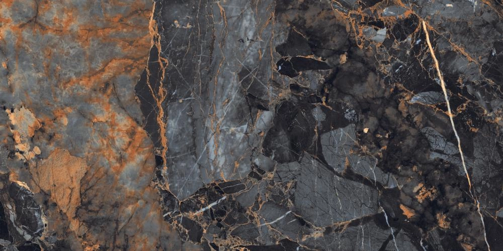 В основе дизайна лежит глубокий, насыщенный черный цвет, напоминающий ночное небо. По его поверхности разбросаны драматичные прожилки и вкрапления, словно золотые и медные россыпи далеких галактик. Контрастные серые и дымчатые участки добавляют текстуре объема и сложности, делая каждый элемент уникальным. Благодаря наличию 8 различных графических рисунков, вы сможете создать на полу или стенах целостное полотно с минимальной повторяемостью, неотличимое от натурального мраморного слэба.