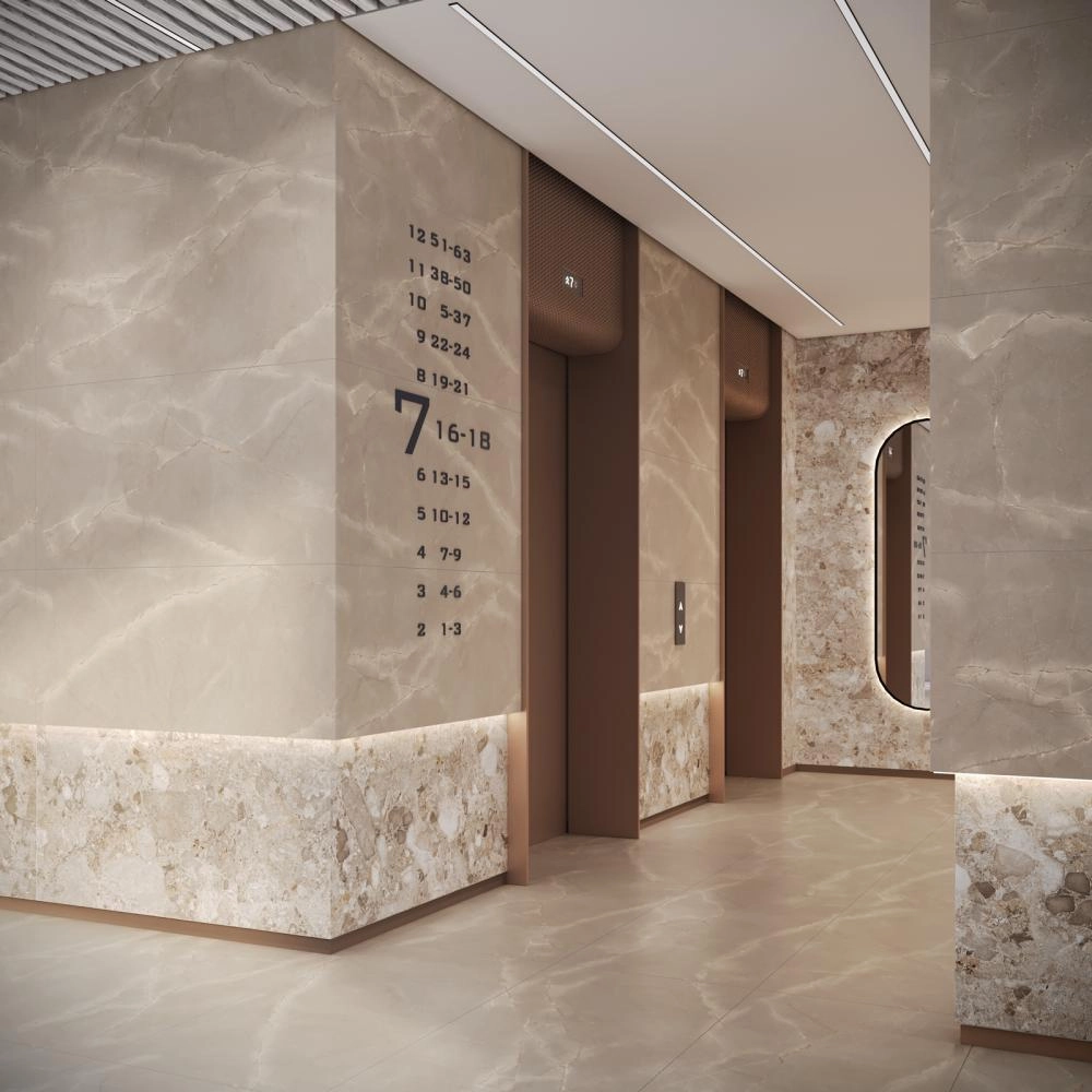 - Универсальность применения: Он прекрасно смотрится как на полу, так и на стенах. Идеален для ванной комнаты, создавая атмосферу SPA-салона, для стильной кухни, элегантного коридора или даже для отделки уличных пространств.