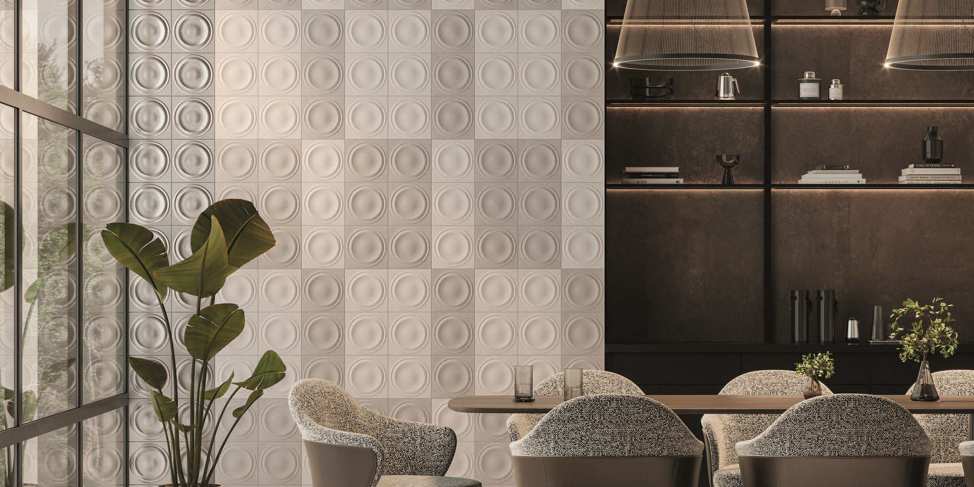 Матовая поверхность передаёт естественную фактуру материала – её можно ощутить при прикосновении. Два артикула дополнены структурой в виде клёпок, что придаёт интерьеру дополнительную динамику и индустриальный характер.